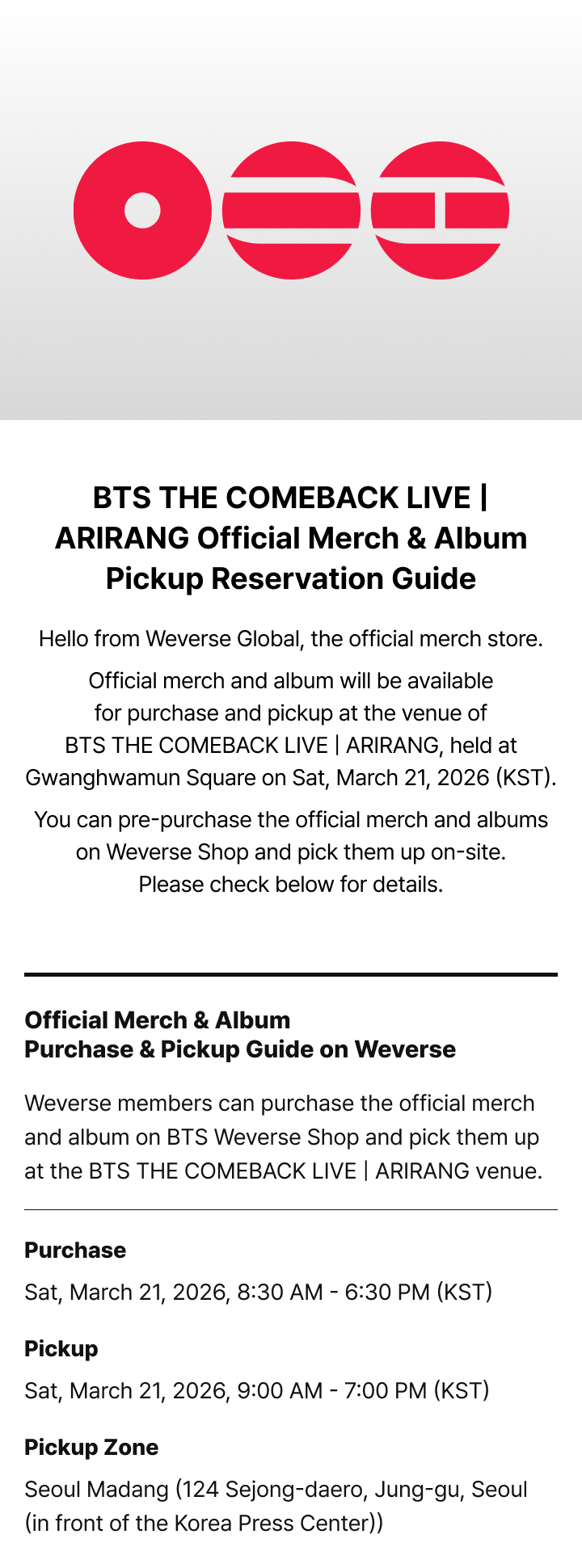 [Weverse Global] BTS THE COMEBACK LIVE | ARIRANG Official Merch & Album Pickup Reservation Guide