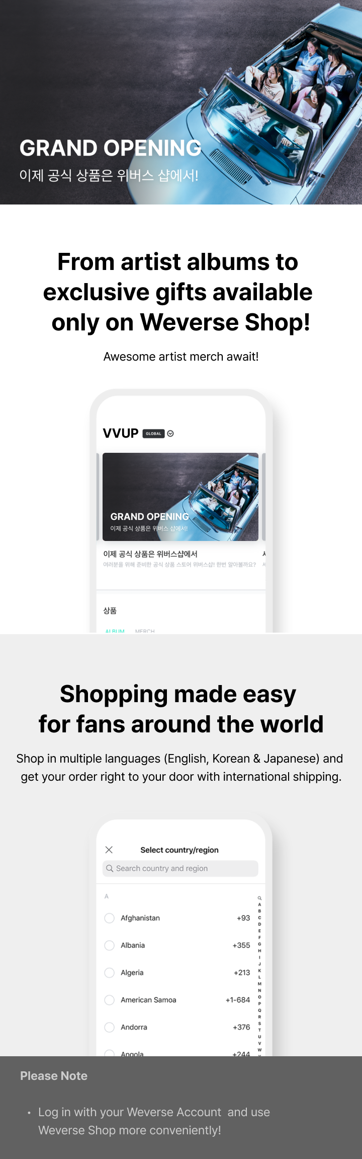 Algunos de los productos vendidos en Weverse Shop son ofrecidos por vendedores particulares que utilizan Weverse Shop como plataforma de venta. En cuanto a los productos vendidos por vendedores particulares, Weverse Company Inc. no es partícipe de las transacciones de comercio electrónico, sino un intermediario de comercio electrónico, que no se responsabiliza por la información o transacciones relativas a los productos mencionados.