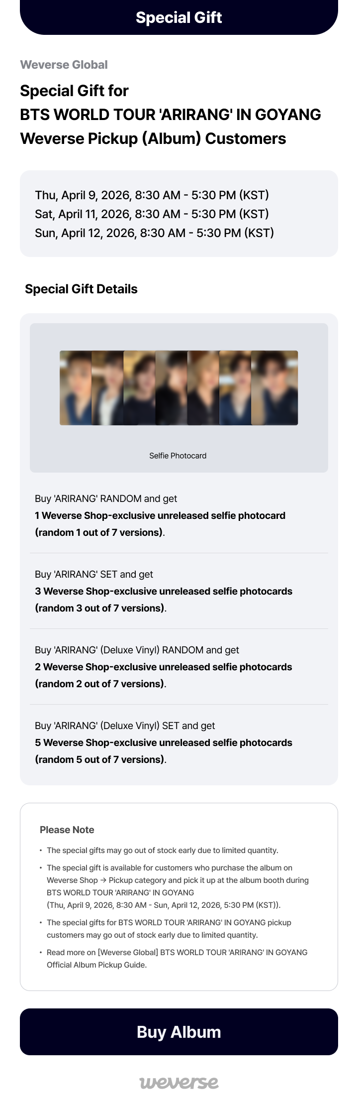 BTS WORLD TOUR 'ARIRANG' IN GOYANG Special Gift for Weverse Pickup (Album) Customers!N