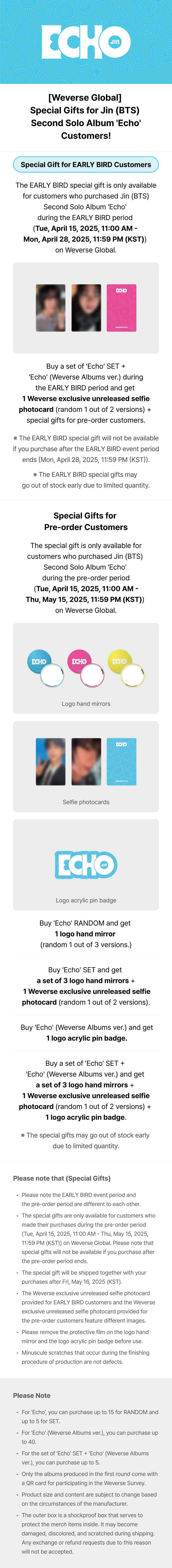 [Weverse Global] Special Gifts for Jin (BTS) Second Solo Album 'Echo' Customers! (2025.05.16 Updated)