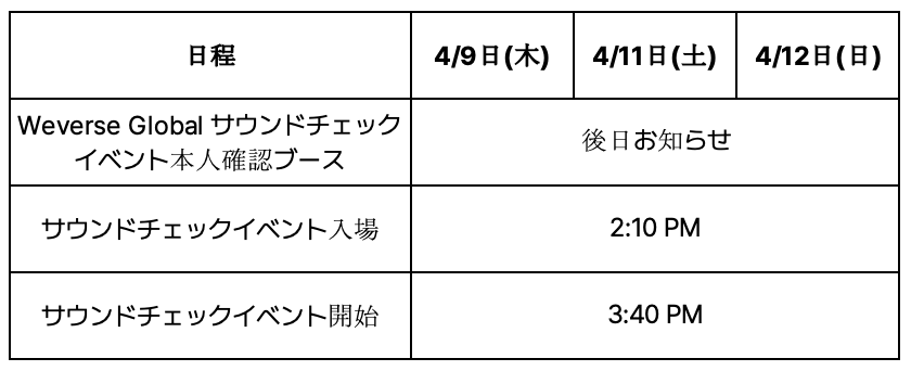 2.Weverse Global サウンドチェックイベント当選者の方は、SOUND CHECK終了後にご退場いただきます。本公演の観覧チケットをお持ちの場合も、恐れ入りますが退場後に改めて再入場をお願いいたします。