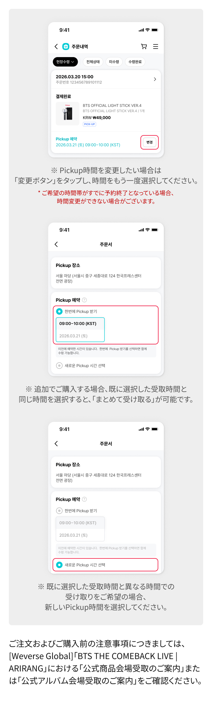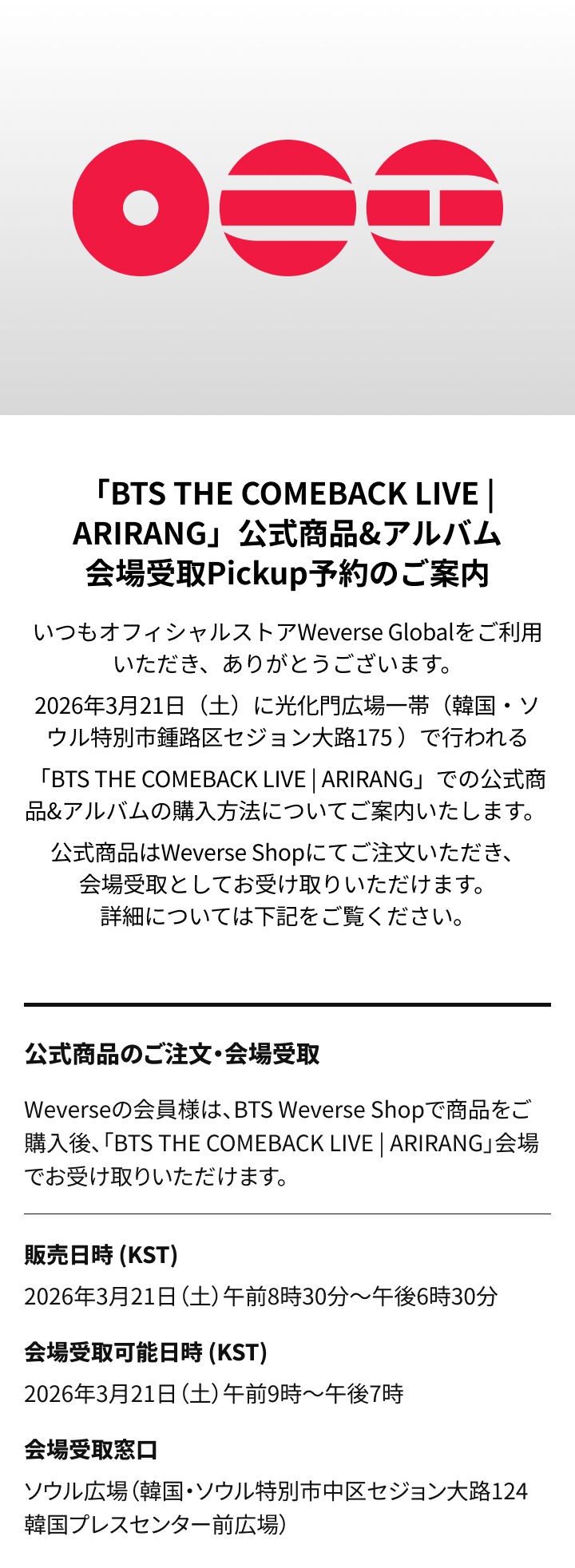 [Weverse Global]「BTS THE COMEBACK LIVE | ARIRANG」公式商品&アルバム会場受取 Pickup予約のご案内