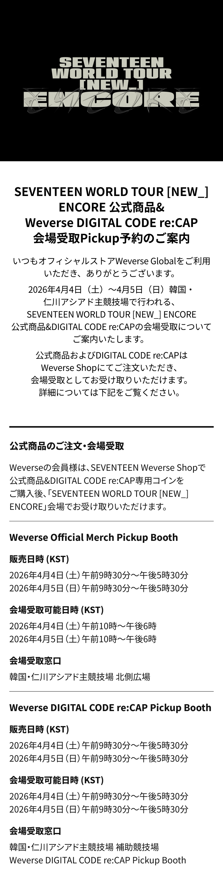 [Weverse Global] SEVENTEEN WORLD TOUR [NEW_] ENCORE 公式商品&Weverse DIGITAL CODE re:CAP 会場受取Pickup予約のご案内N