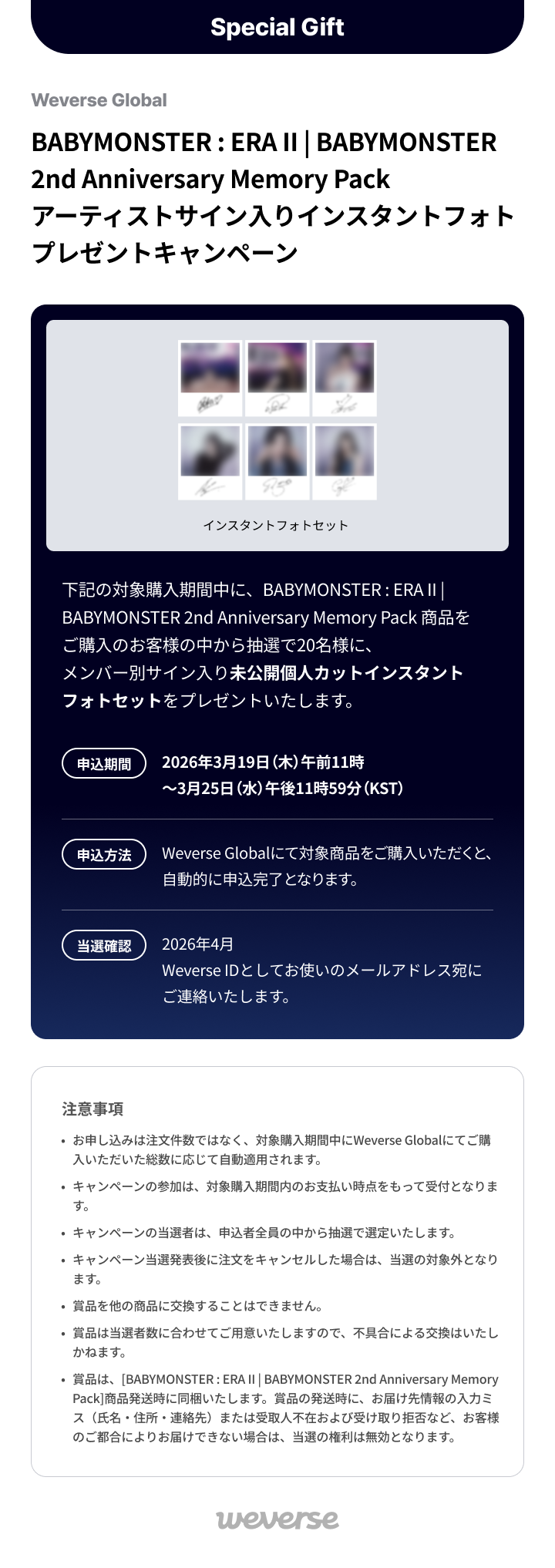 BABYMONSTER : ERA II | BABYMONSTER 2nd Anniversary Memory Pack アーティストサイン入りインスタントフォトプレゼントキャンペーン