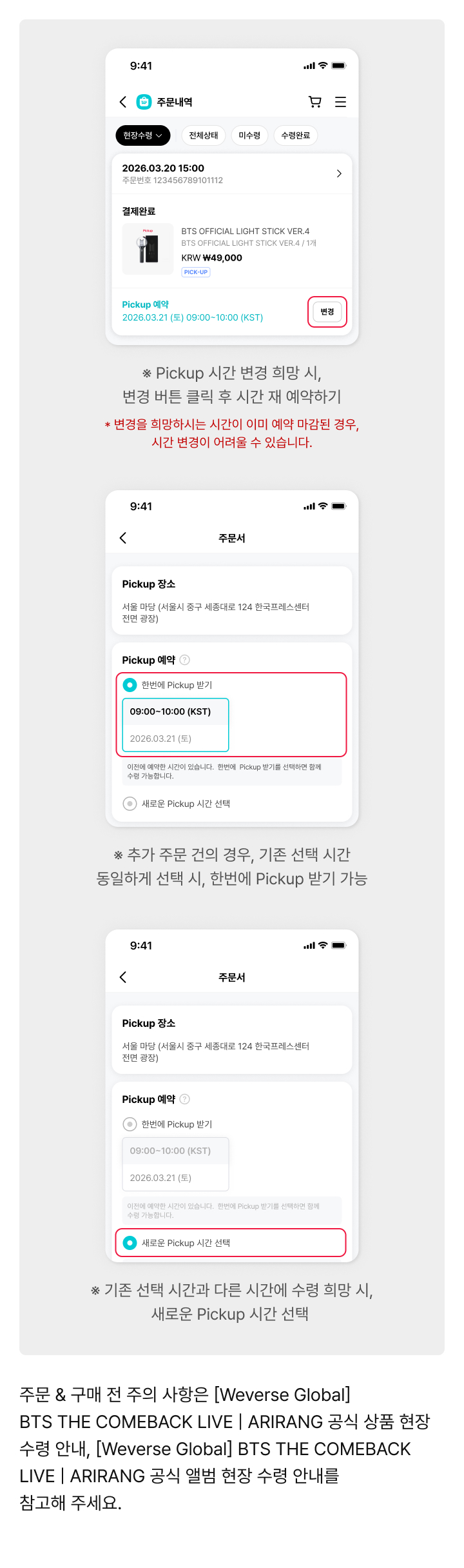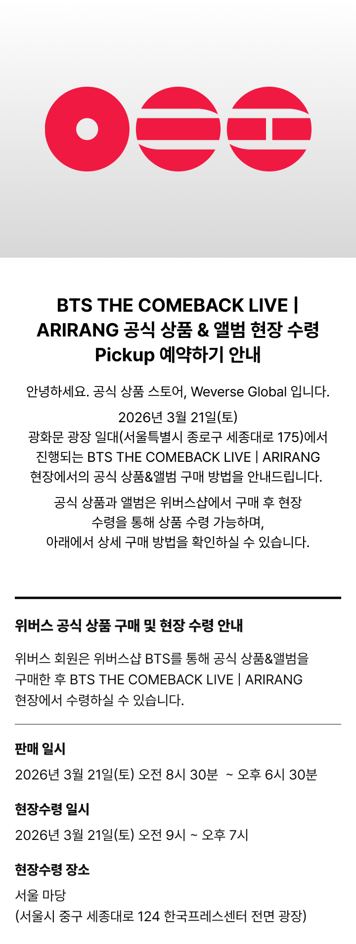 [Weverse Global] BTS THE COMEBACK LIVE | ARIRANG 공식 상품&앨범 현장 수령 Pickup 예약하기 안내