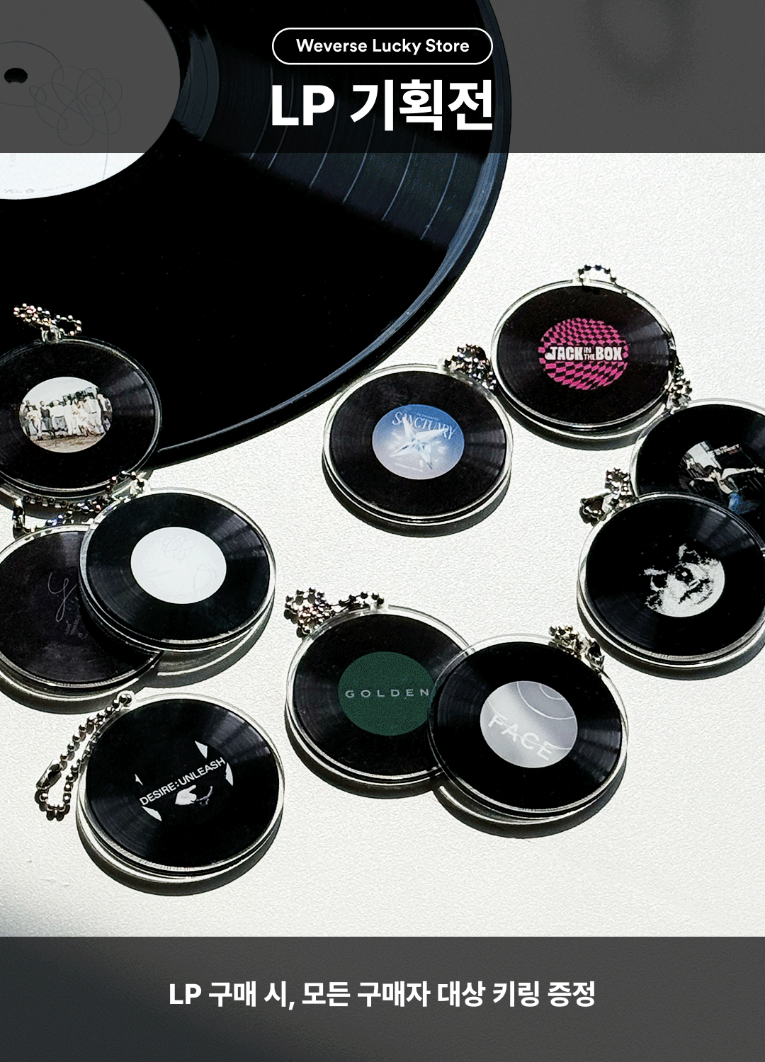 - Weverse Lucky Store 에서 LP를 구매하시면, 해당 앨범별 레코드 모양의 키링 1종을 증정합니다.
