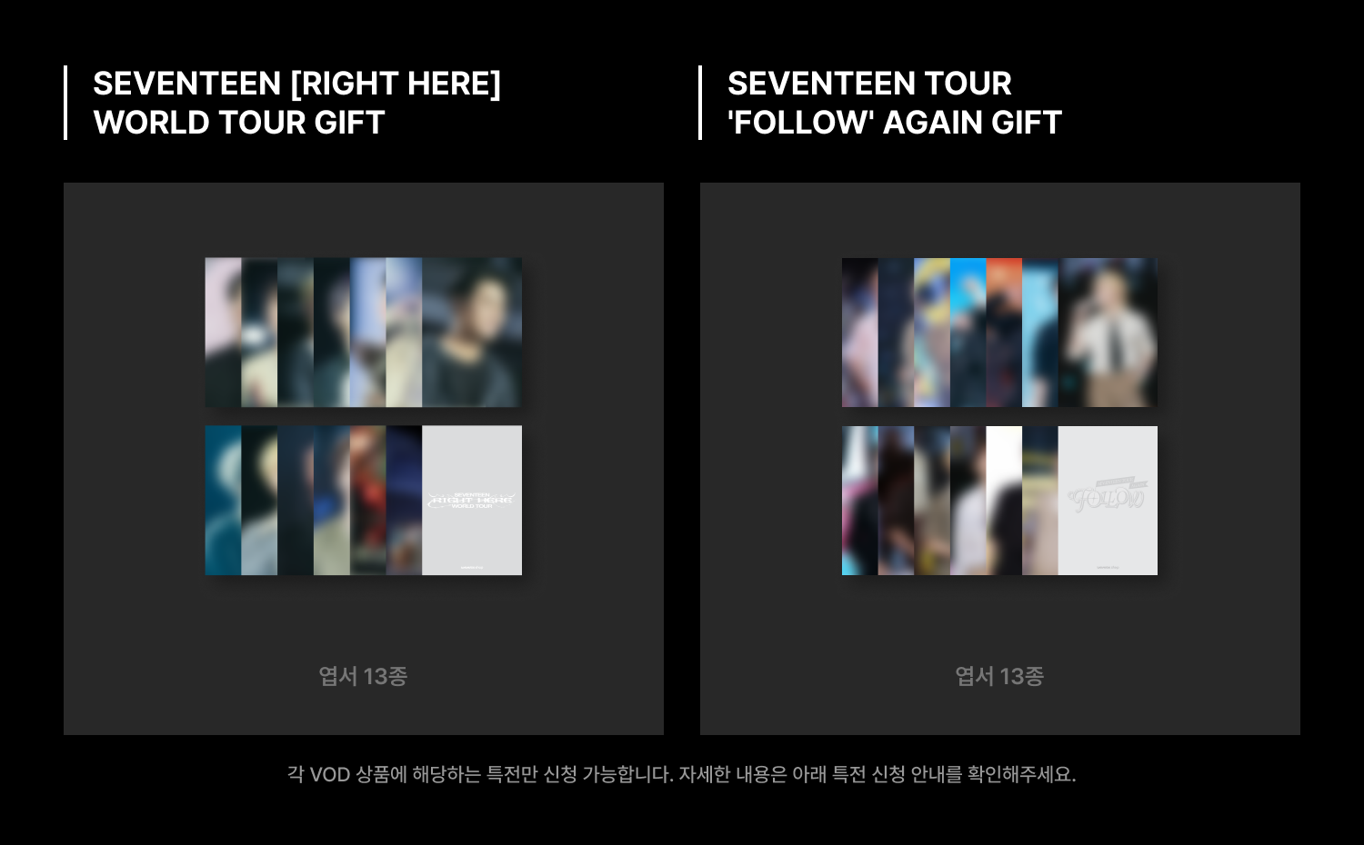 ② 특전은 예약 판매 기간 동안 위버스샵 웹사이트에서 <SEVENTEEN TOUR 'FOLLOW' AGAIN 또는 SEVENTEEN [RIGHT HERE] WORLD TOUR > VOD를 구매하고, 동일한 웹사이트에서 배송비까지 결제한 고객만 신청 가능합니다.