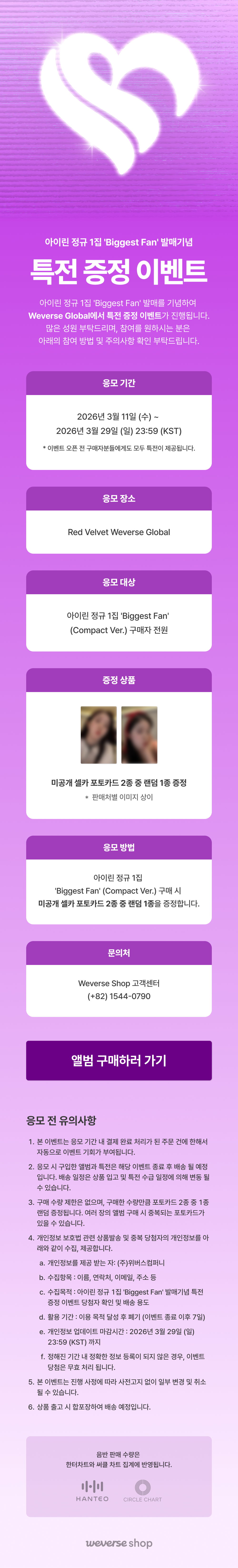 [Weverse Global] 아이린 정규 1집 'Biggest Fan' 발매기념 특전 증정 이벤트 (26.03.23 updated)