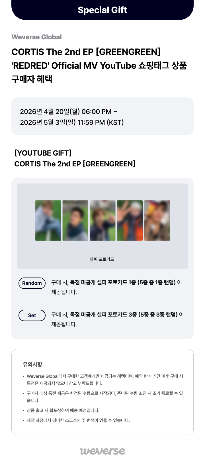 [Weverse Global] CORTIS The 2nd EP [GREENGREEN] 'REDRED' Official MV YouTube 쇼핑태그 상품 구매자 혜택