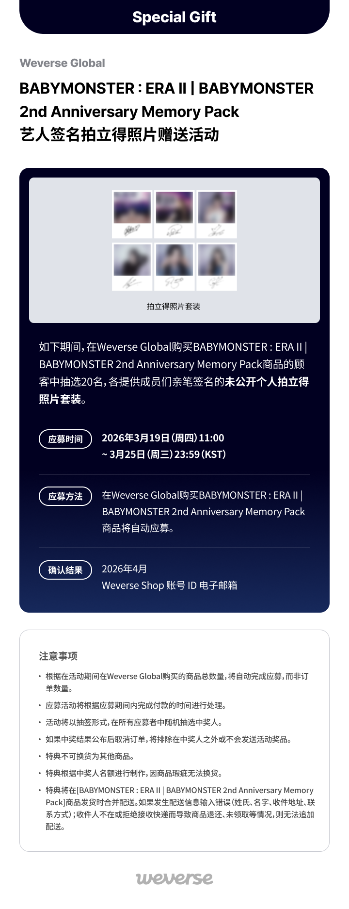 BABYMONSTER : ERA II | BABYMONSTER 2nd Anniversary Memory Pack艺人签名拍立得照片赠送活动