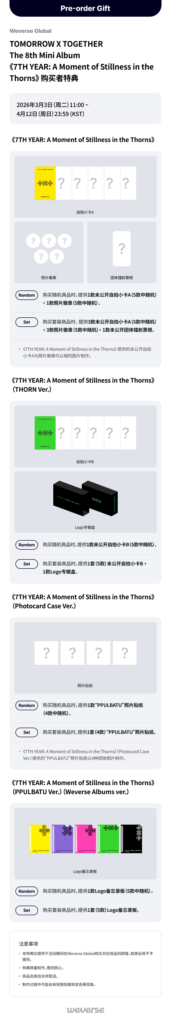 【Weverse Global】TOMORROW X TOGETHER The 8th Mini Album《7TH YEAR: A Moment of Stillness in the Thorns》购买者特典