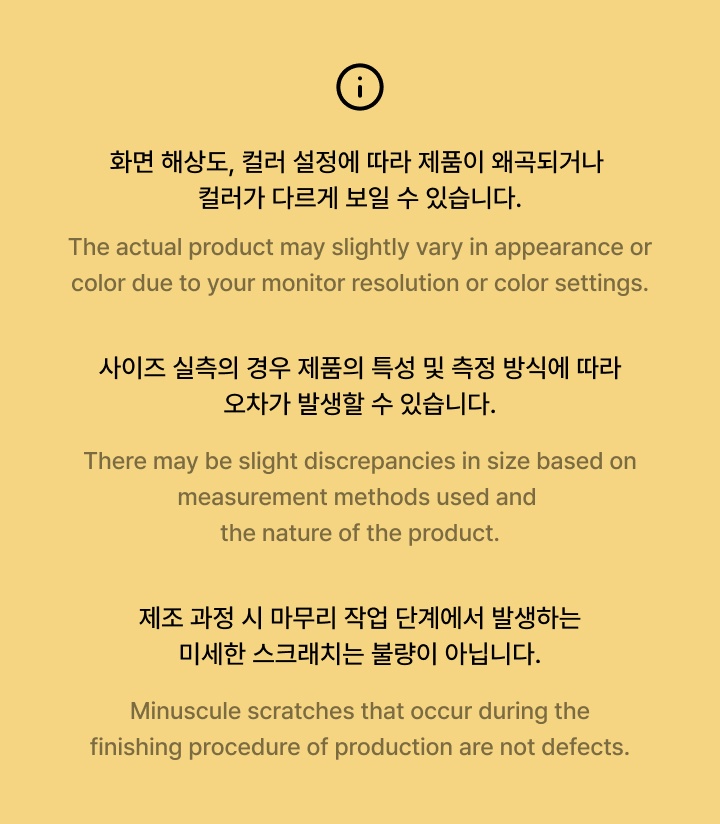Use the product only for its intended purpose. Wipe gently with a soft cloth or a tissue when contaminated. Do not use bleach or fabric softeners. Keep away from impacts, fire, direct sunlight, and high temperatures. Keep away from sharp objects. Avoid using the product in humid environments. Be careful not to slip. Avoid machine-washing and ironing to prevent damage. Avoid leaving the product wet with water or sweat for a prolonged period of time. Due to the nature of the fabric, shedding may occur. Be careful of friction as it may pilling and discoloration. Actual product size may vary slightly. We are not responsible for damages caused by customer negligence.