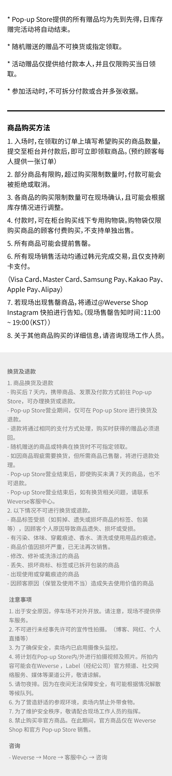 於Weverse Shop販售的商品包含進駐Weverse Shop的個人賣家商品,對於個人賣家所販售之商品,Weverse Company Inc.身為通訊銷售仲介方,而非當事方,則不對任何登錄商品的資訊及交易負責。