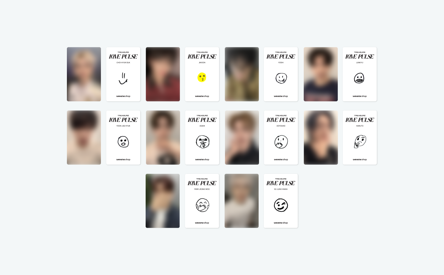 - 购买TREASURE 3rd MINI ALBUM《LOVE PULSE》METAL & STREET & ROCKCHIC VER.(Set),10款中随机提供3款Weverse独家自拍小卡(表情包 ver.)。