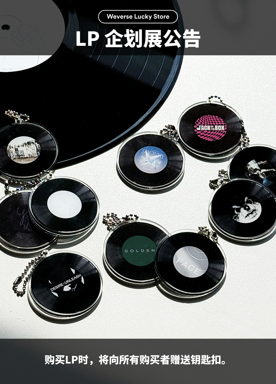- 在Weverse Lucky Store购买LP,提供1款所购买的专辑款式的钥匙扣。