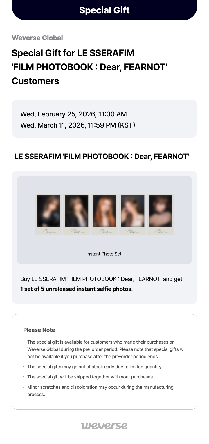 [Weverse Global] Special Gift for LE SSERAFIM 'FILM PHOTOBOOK : Dear, FEARNOT' Pre-order Customers